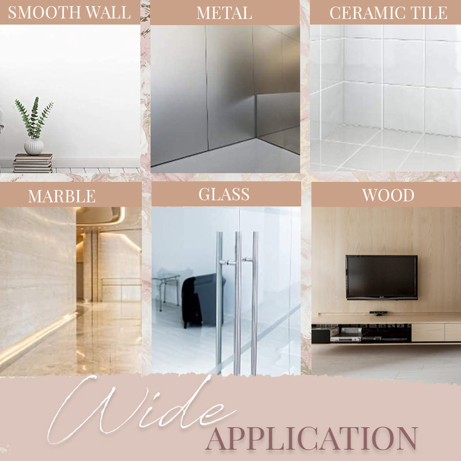 Can be applied to many surface such as ceramic tile, marble, glass, metal, smooth wall, and smooth wood!